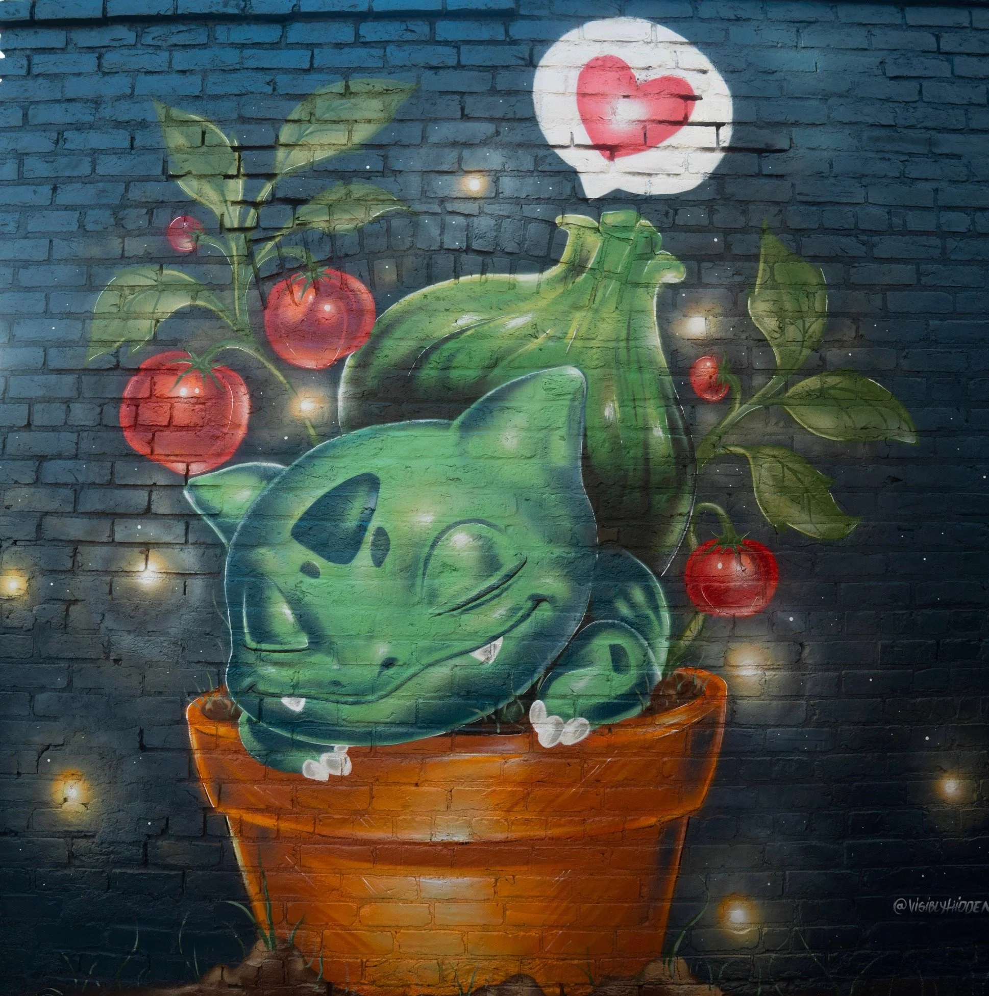 “The mural is about appreciating plant life such as vegetables, growth, and nature. At its center is a Bulbasaur in slumber, representing a coexistence of life and plant appreciation. Though fictional, Bulbasaur is a unique symbol: a living creature that is also a plant. It reflects how we value and connect with living beings, whether a dog, a cat, or in this case, an imagined plant-animal hybrid.